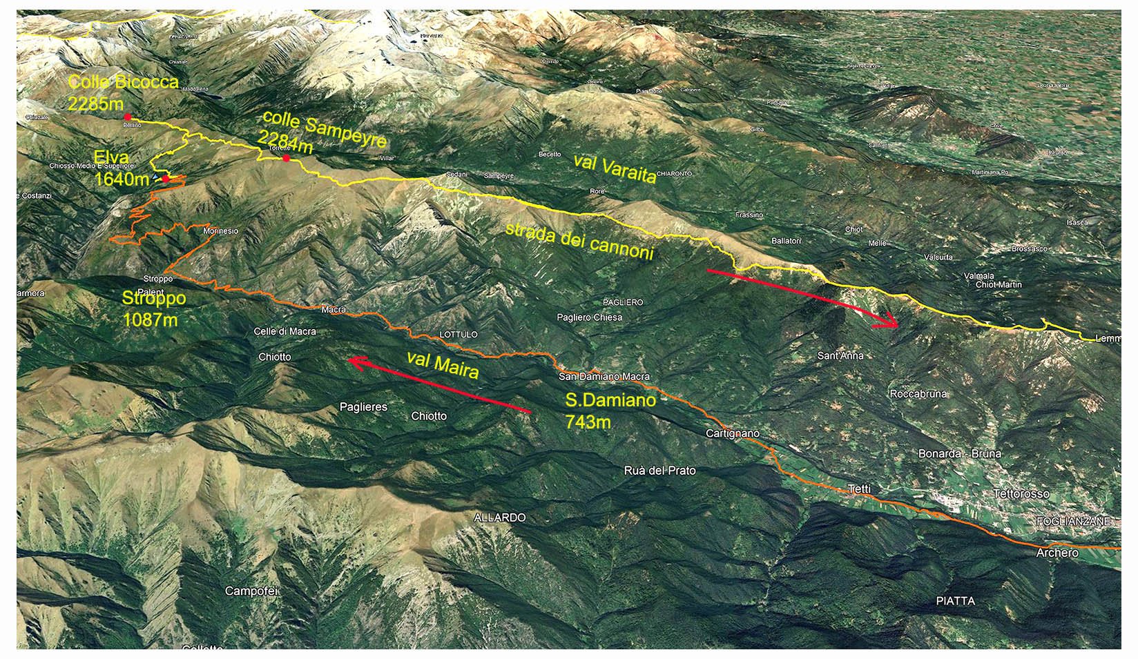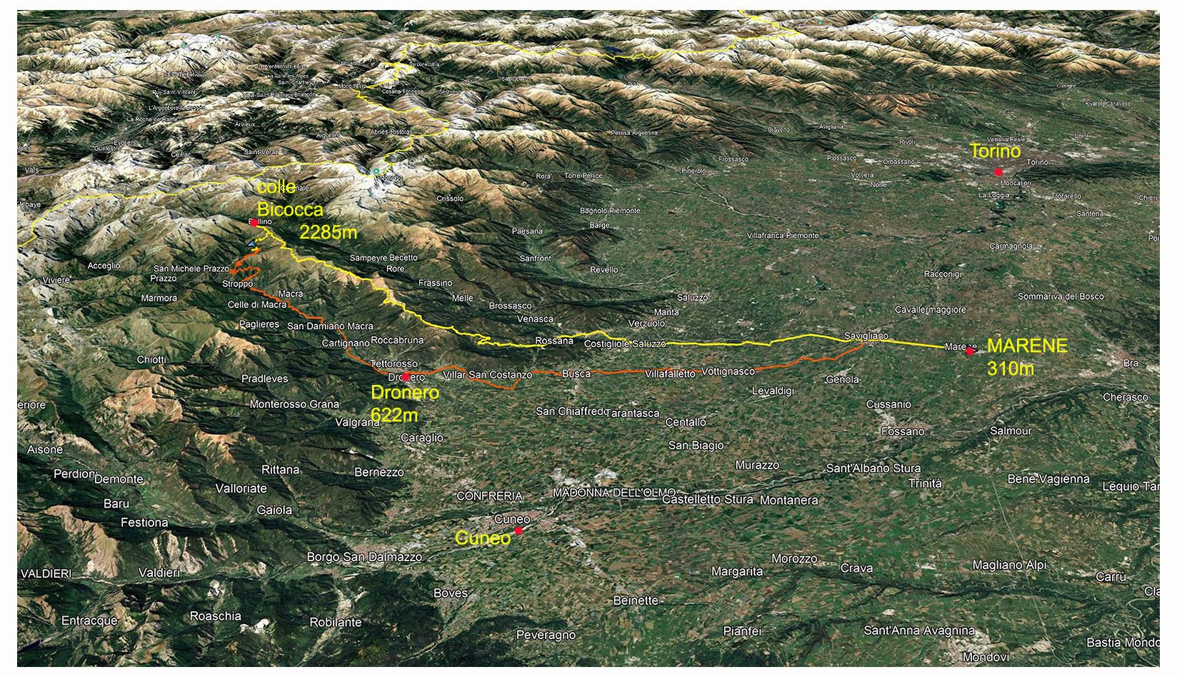 ![]() 2 le tracce dei due giorni, in arancione il sabato, da Marene a Elva risalendo la val Maira, 91 km con 1910 metri di dislivello positivo, in giallo la domenica, salita al colle Bicocca e poi 40 chilometri di strada dei cannoni sulla dorsale tra le valli Maira e Varaita, 90 km + 1030 metri |