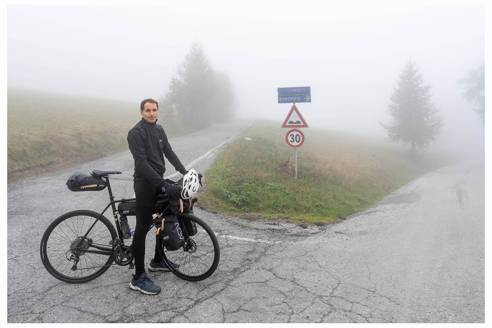 ![]() 22 da una certa quota in su, siamo nella nebbia. Meno male che ci siamo coperti in anticipo, il garmin ha registrato una minima di 6 gradi, e una media giornaliera di 17 |