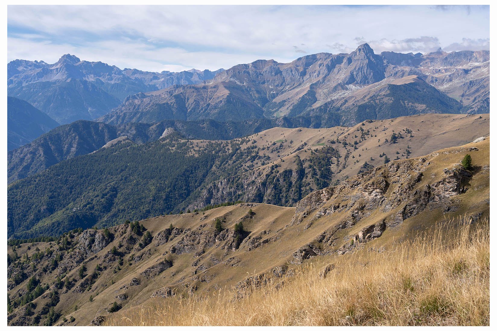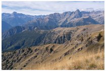 ![]() 3 La parte alta delle due tappe, si può notare la strada dei cannoni, ex strada militare che corre appena sotto la dorsale che separa le valli Maira e Varaita, quasi sempre sul versante della prima. |