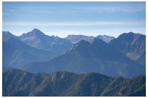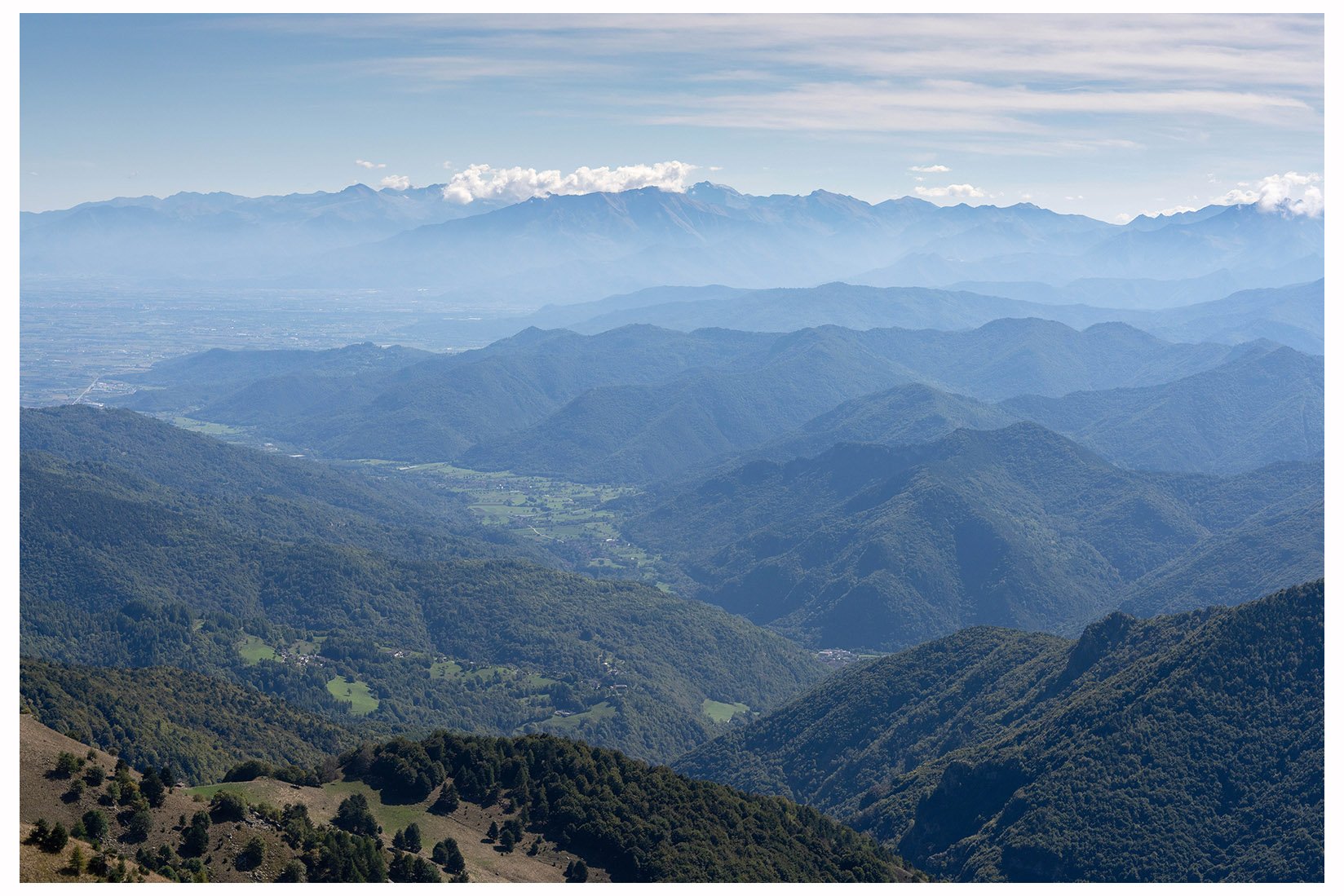 ![]() 50 la bassa val Maira e sullo sfondo tutti gli imbocchi delle valli più a sud, la val Grana, la Stura, la valle Gesso, la Vermenagna che sale verso Limone Piemonte e poi la valle Pesio e siamo ormai in Liguria |