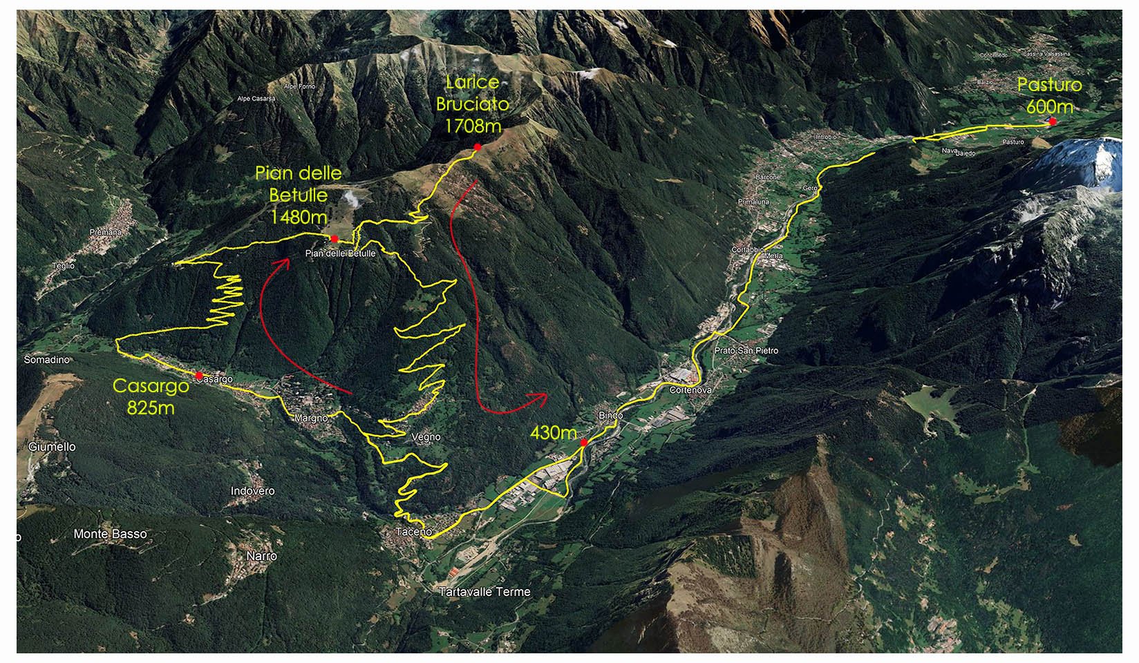 2 in giallo la traccia, 54,7 km con 1540 metri di dislivello positivo. Da Pasturo percorro la ciclabile fino a Taceno e poi salgo a Casargo e al piano delle Betulle da cui su strada sterrata (o cementata) raggiungo il Larice Bruciato, giù per altra strada sterrata direttamente su Taceno e ritorno ancora per la ciclabile.