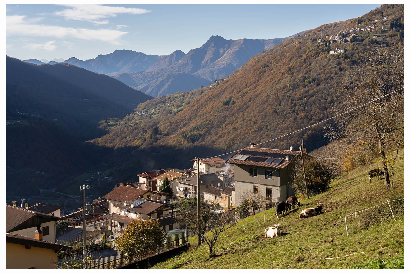 6 lascio la ciclabile a Taceno e inizio a salire verso Margno (in foto) e Casargo, in alto a sinistra il Legnone, anche lui ben spruzzato di neve