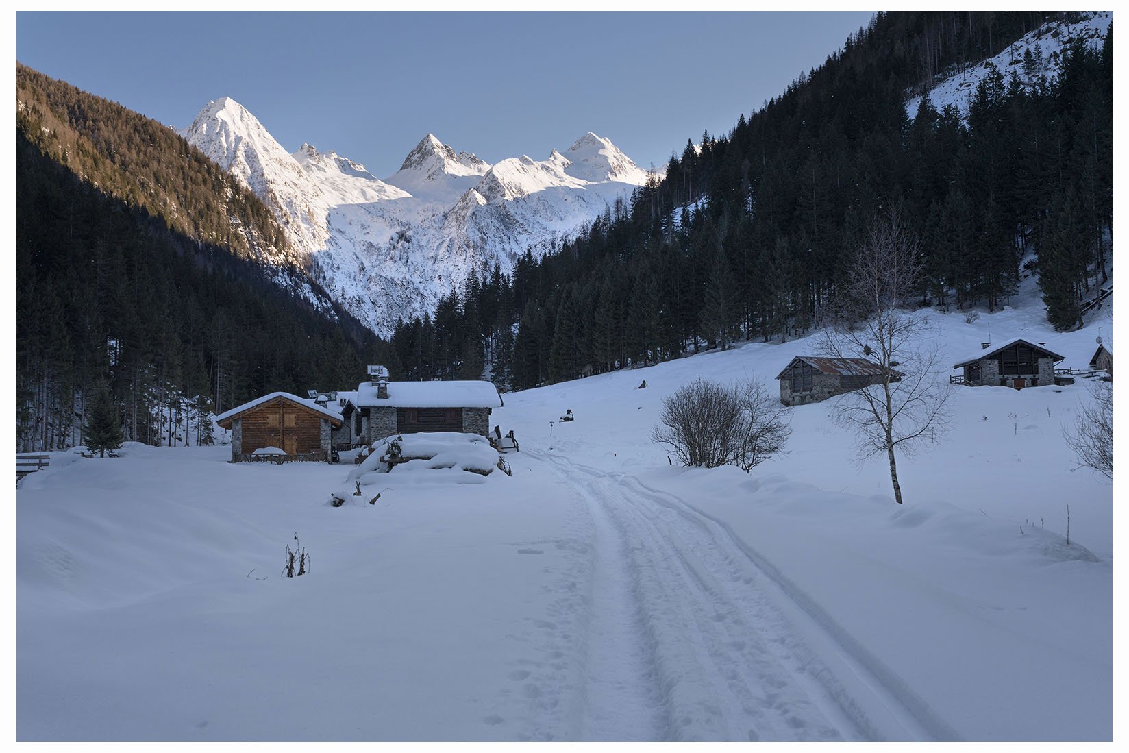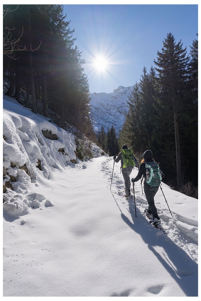 3 subito in partenza indossiamo i ramponcini perchè la strada è coperta di ghiaccio e neve pressata dai passaggi, dopo la prima rampa faticosa il sentiero spiana e compaiono le belle cime alla testata della valle