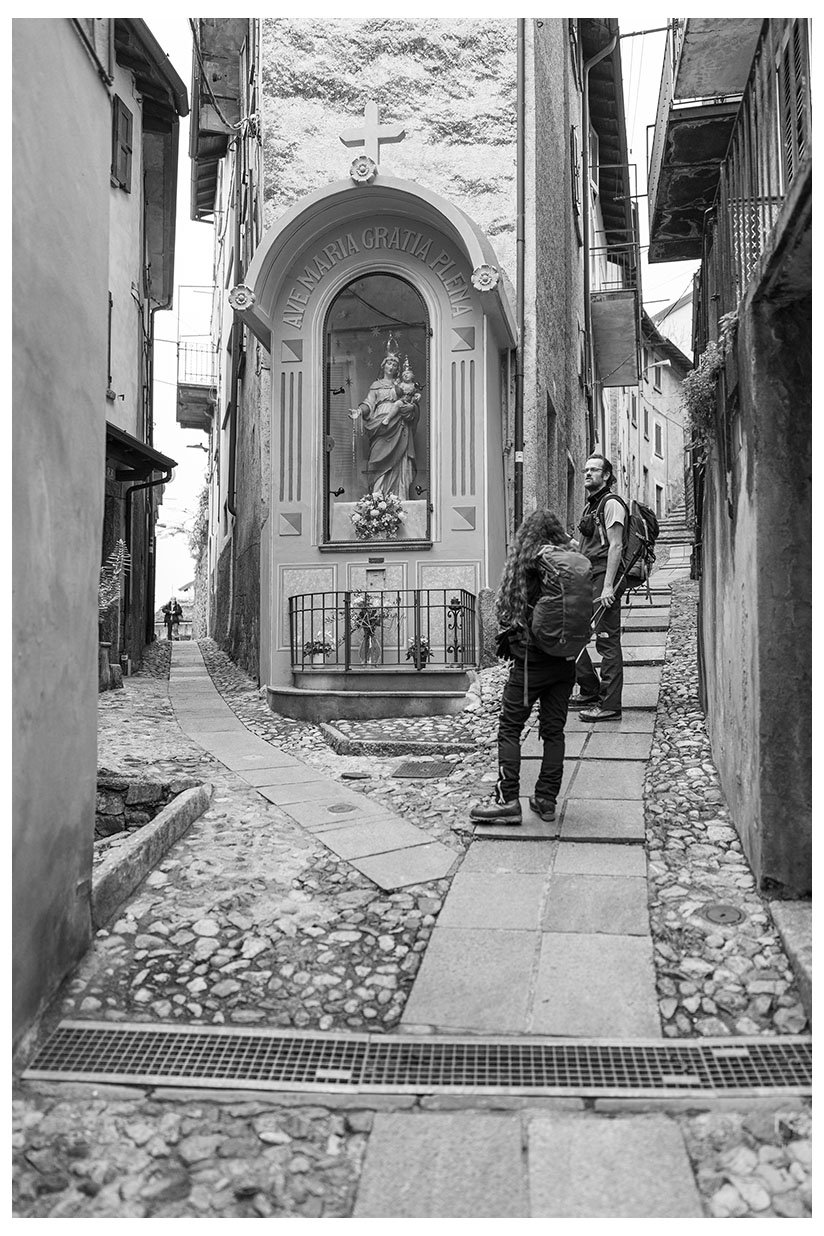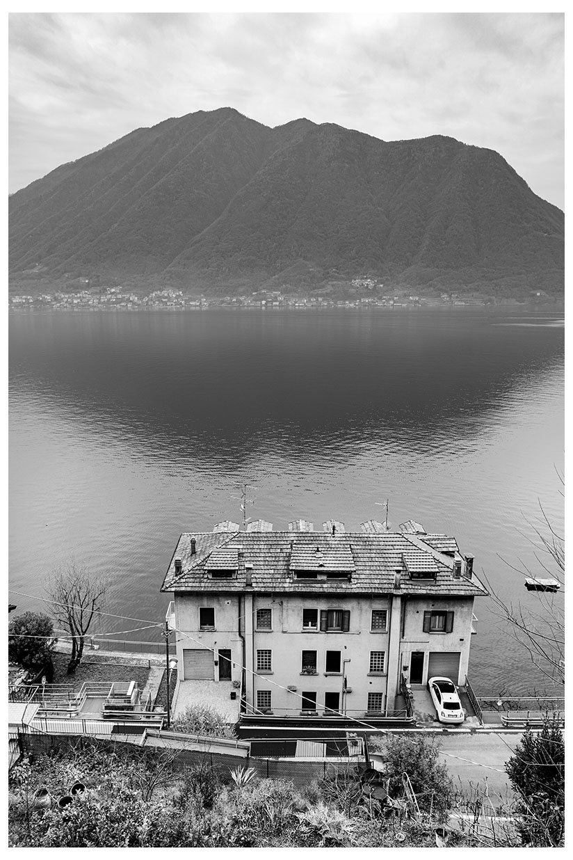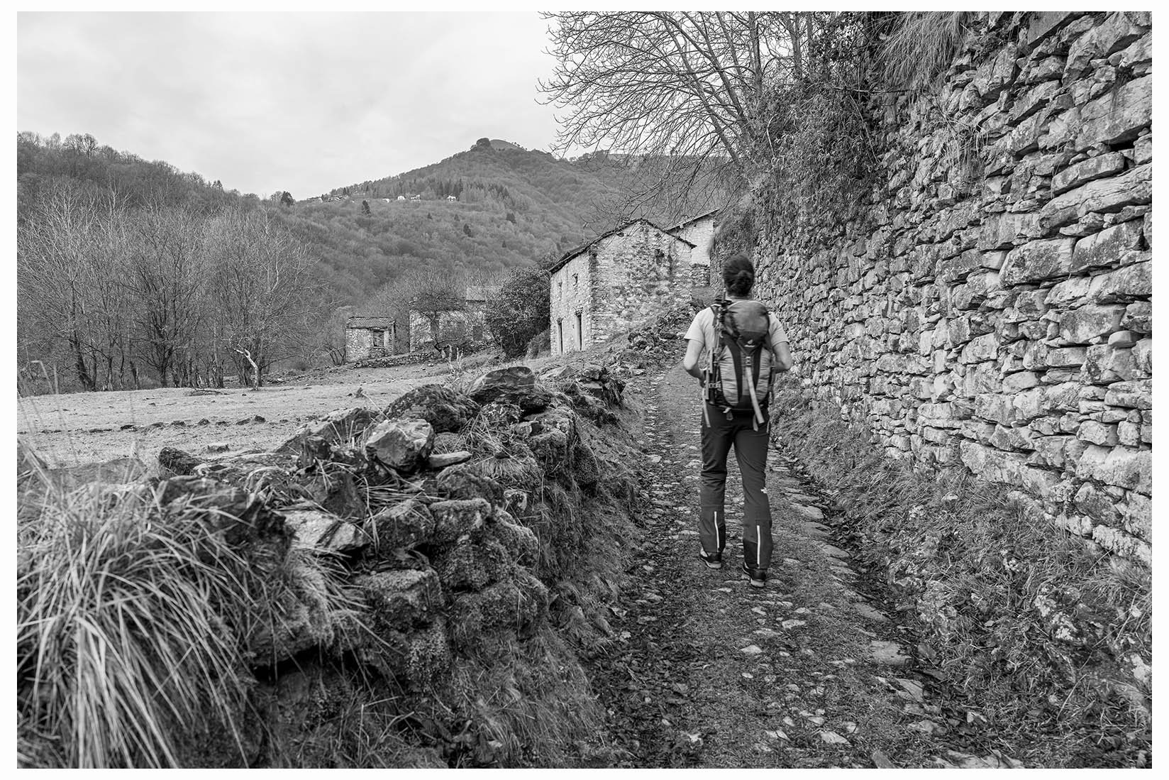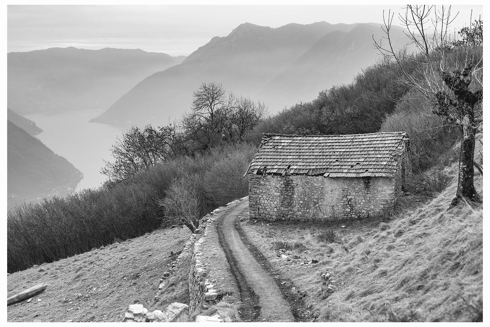 1 Ogni tanto lascio la bici in garage e metto gli scarponcini. La giornata è grigia e potrebbe anche arrivare un pochetto di pioggia, inutile andare troppo lontano, mi accontento di un giretto sui monti lariani appena oltre Argegno, con me vengono Bore e Marika. Visto che senza sole non ci sono colori per questo giretto ho fotografato in bianco e nero. Lasciamo la macchina a Colonno (dove inizia la Greenway ) e si parte subito in salita