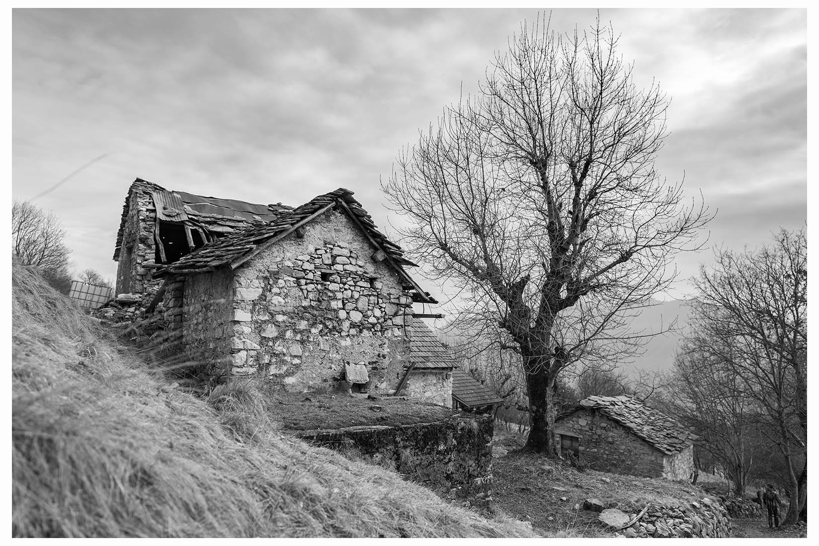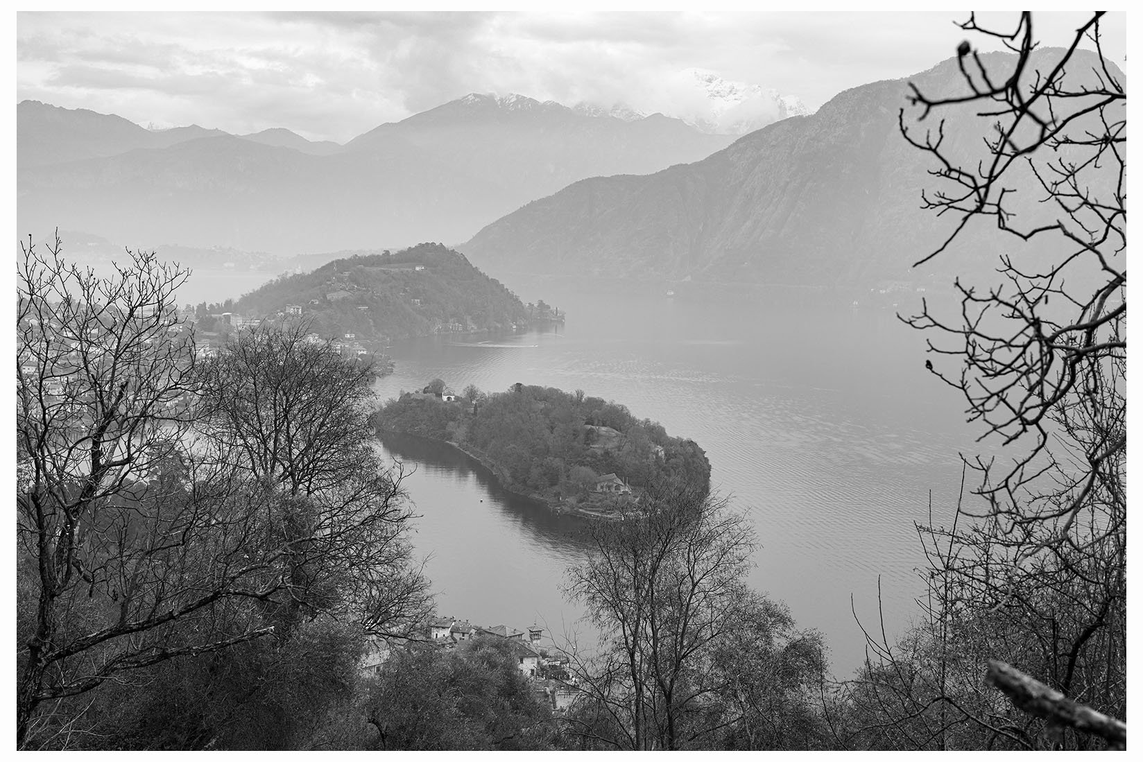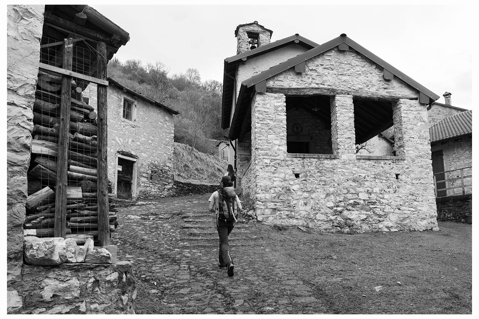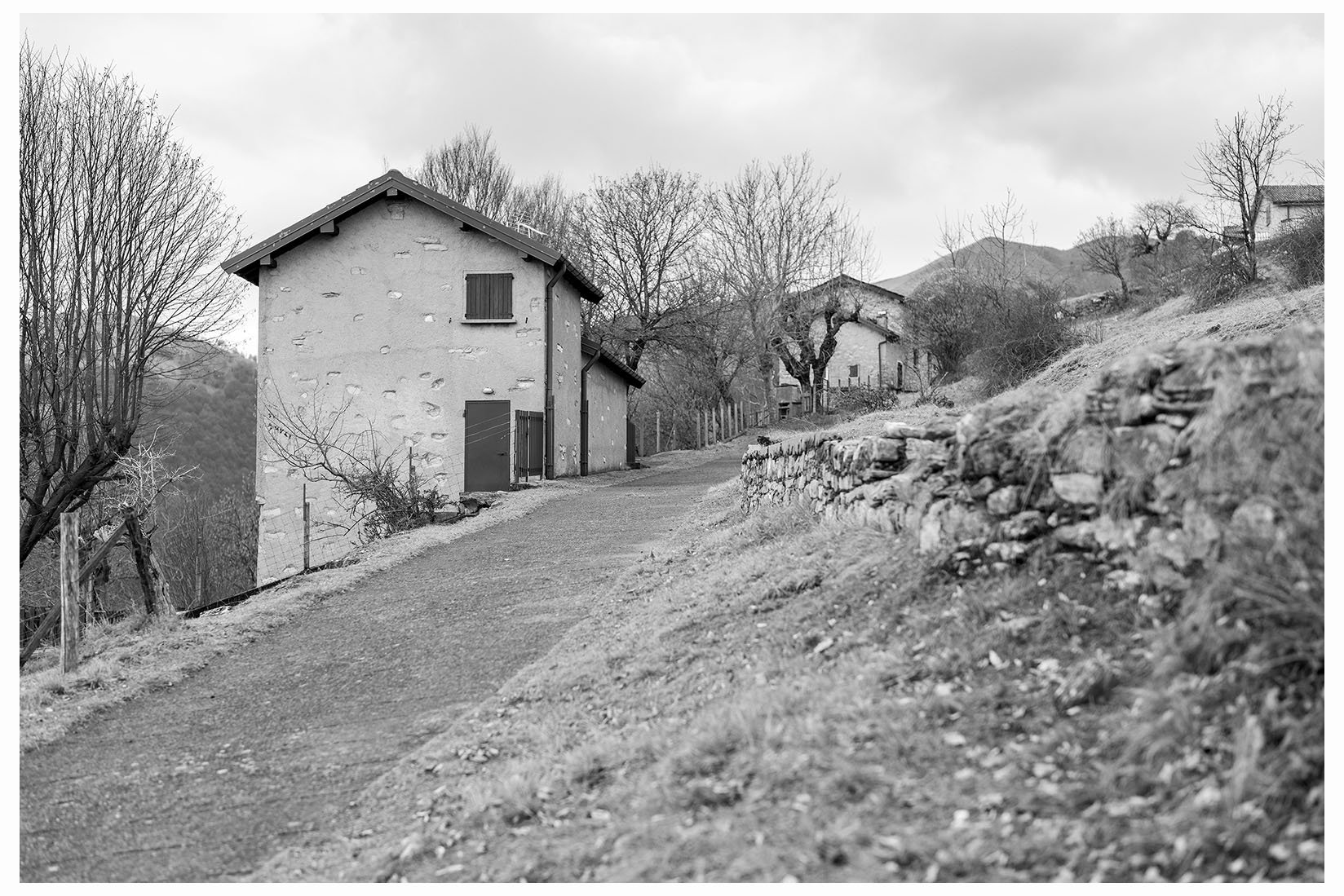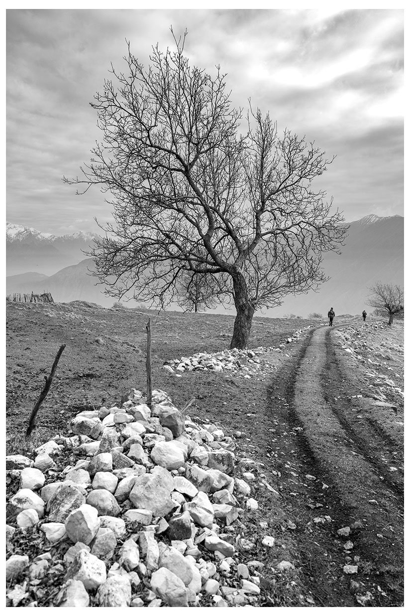 1 Ogni tanto lascio la bici in garage e metto gli scarponcini. La giornata è grigia e potrebbe anche arrivare un pochetto di pioggia, inutile andare troppo lontano, mi accontento di un giretto sui monti lariani appena oltre Argegno, con me vengono Bore e Marika. Visto che senza sole non ci sono colori per questo giretto ho fotografato in bianco e nero. Lasciamo la macchina a Colonno (dove inizia la Greenway ) e si parte subito in salita