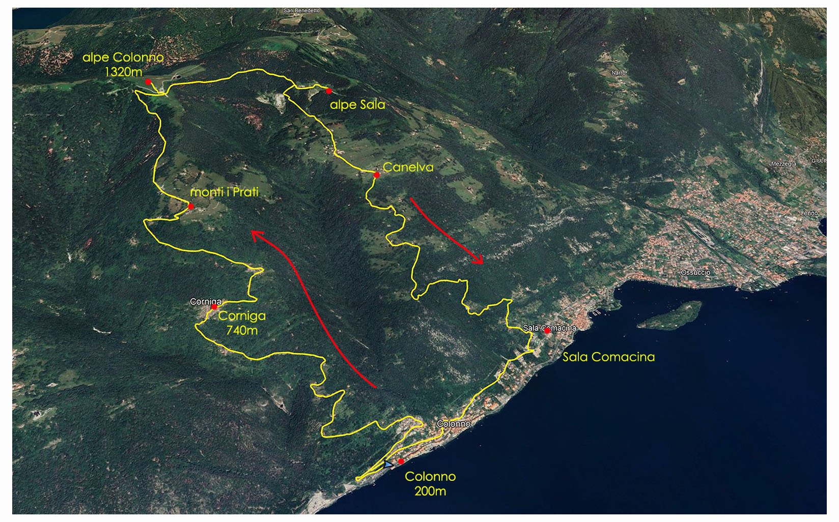 2 la traccia del giro, lunghezza 14,8 chilometri con 1110 metri di dislivello positivo. Da Colonno saliamo fino all'alpe omonima e poi scendiamo per un'altra mulattiera verso Sala Comacina, rientro a Colonno lungo la Green Way