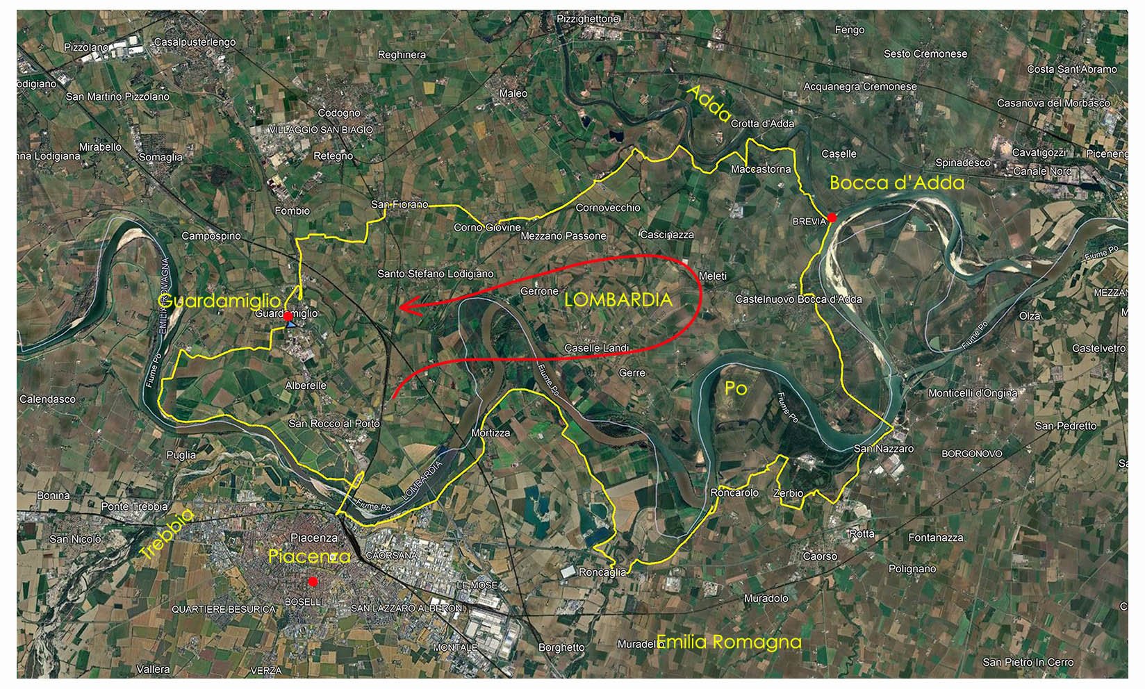 2 Ecco l'anello che abbiamo percorso , 80 chilometri con 240 metri di dislivello positivo. Partenza da Guardamiglio, attraversiamo il Po a Piacenza e poi stiamo sul versante emiliano fino al ponte a San Nazzaro. Capatina a Bocca d'Adda, dove il fiume che nasce in alta Valtellina si congiunge al Po, poi "dritti" al punto di partenza