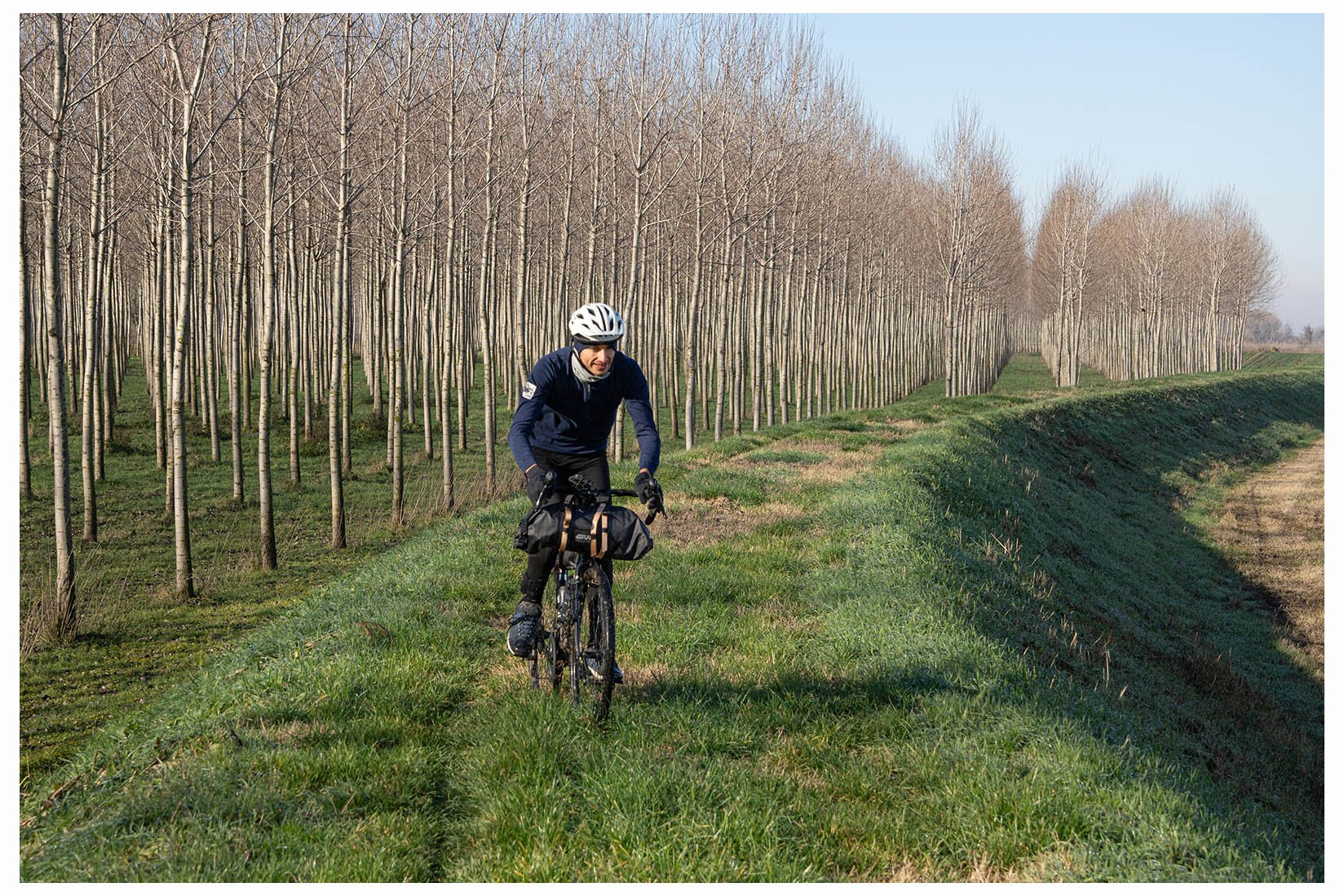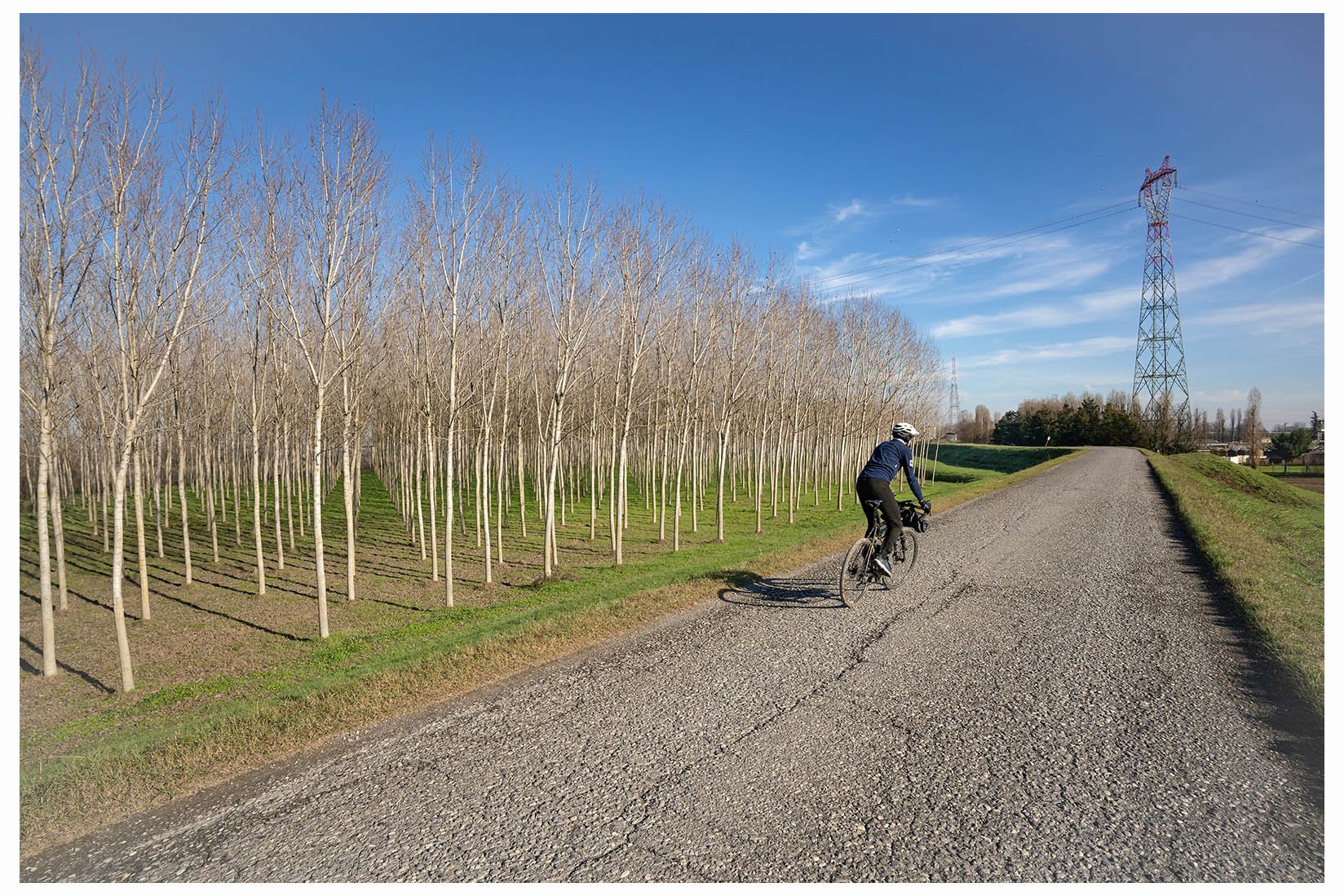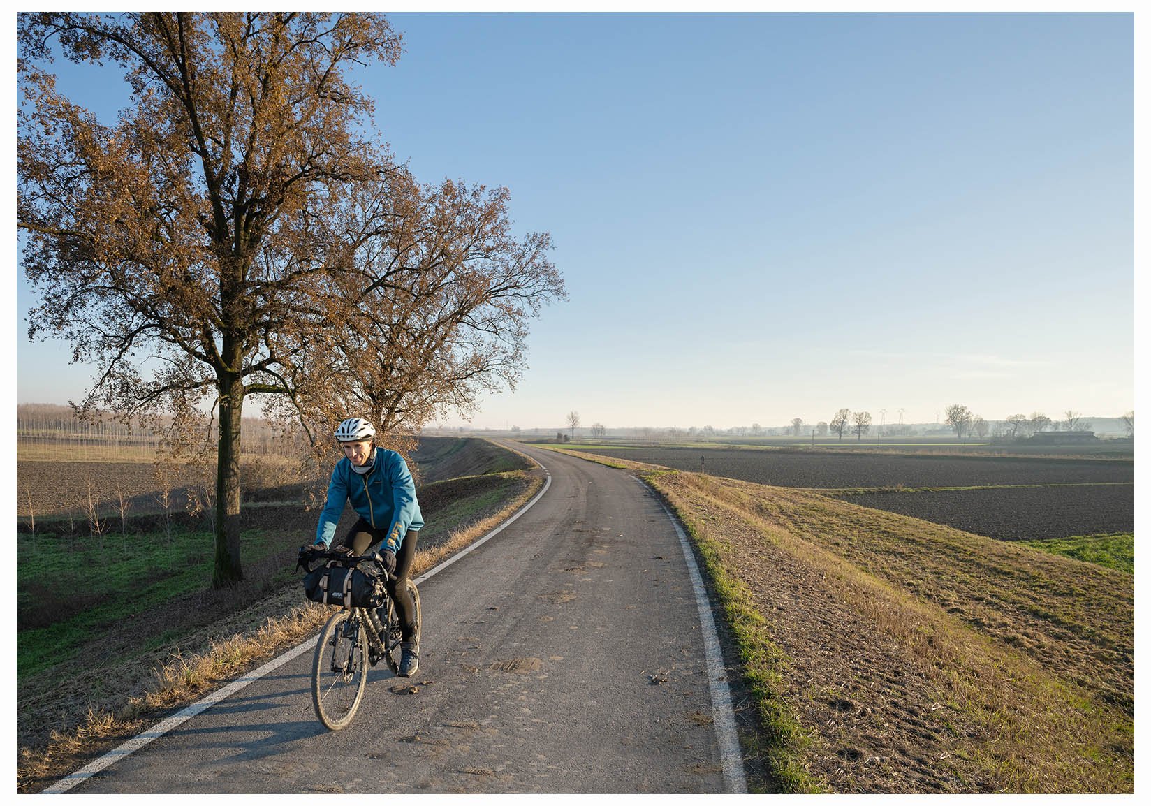 1 Come negli anni scorsi, nella stagione fredda faccio qualche giro nella bassa, in modo da evitare salite e sudate fastidiose quando la temperatura è prossima allo zero. Questa volta partenza da Guardamiglio, provincia di Lodi, poco prima del ponte che attraversa il Po lungo l'autostrada appena prima di entrare in Piacenza. Con l'amico Andrea, due pedalate e siamo fuori dal paesino, subito tra i campi