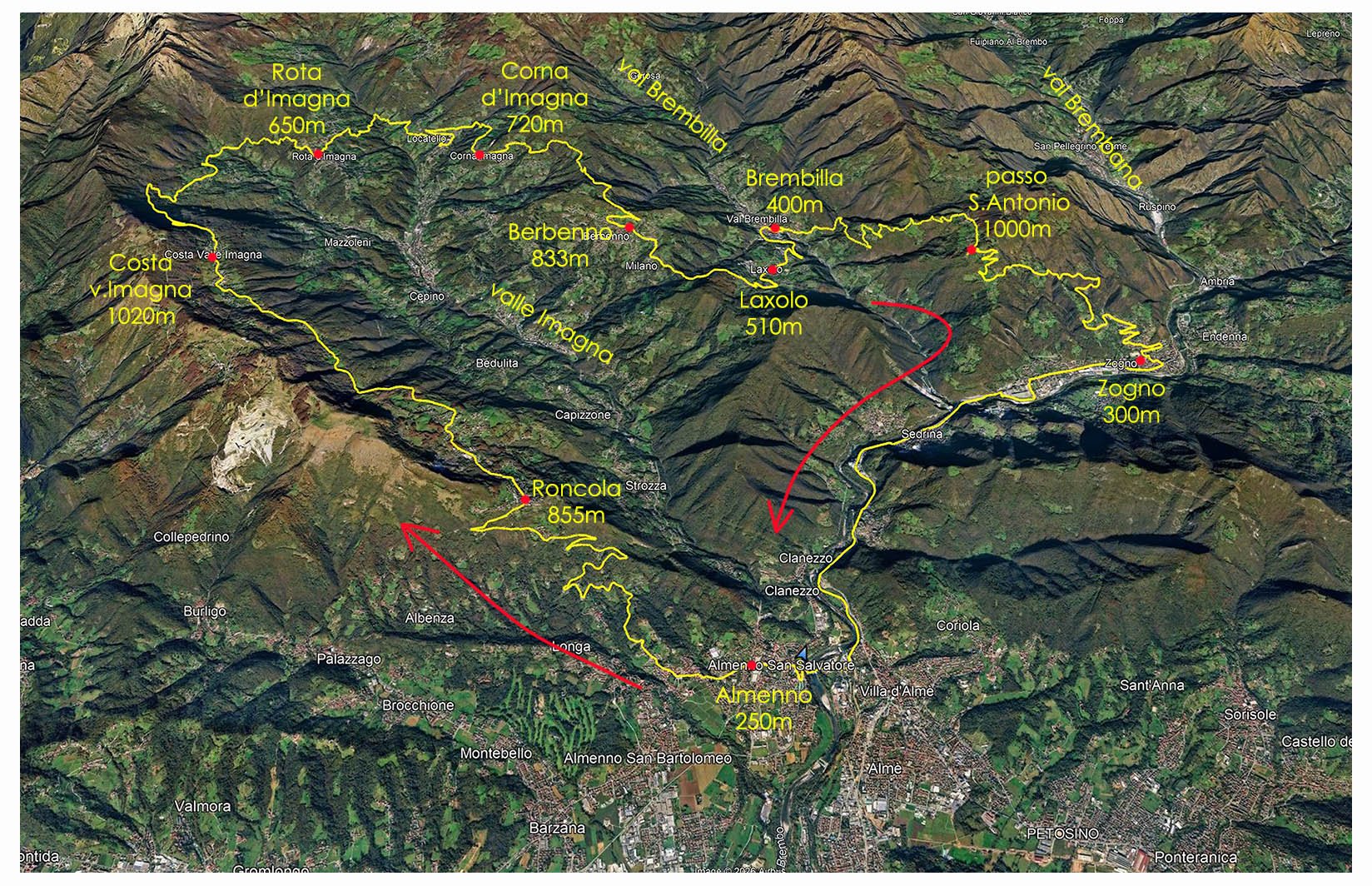 2 Ecco la traccia, lunghezza 70 chilometri, dislivello positivo 1970 metri. Il giro, per lo più su asfalto, contiene tre salite, la prima duretta fino a Roncola, la seconda, più semplice dalle parti di Corna d'Imagna e la terza (molto dura anche lei) tra Brembilla e il passo di Sant'Antonio Abbandonato. Ci sono tre tratti sterrati, il primo tra Costa e Rota, poi un altro un pò scassato tra Rota e Corna, infine uno molto carino tra Corna e Berbenno, detto strada della Baghina