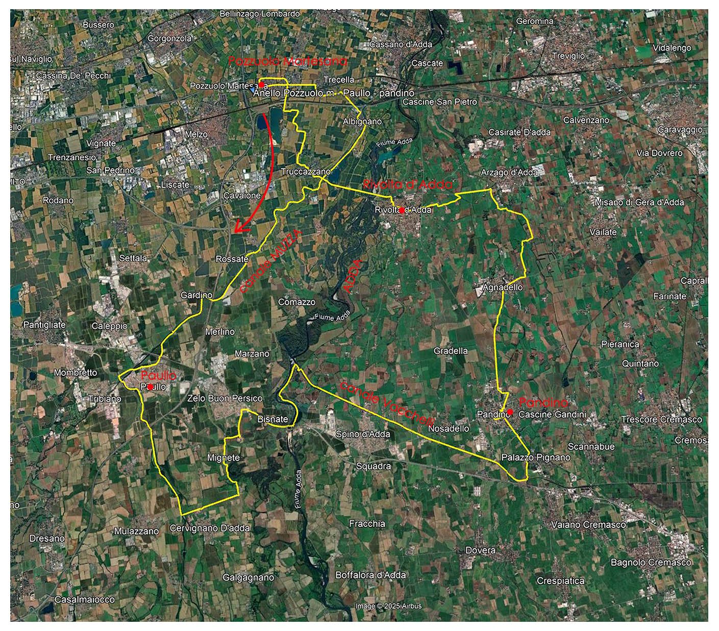 2 Ecco l'anello, lunghezza 75 km con circa 260 metri di dislivello positivo (che non mi sono accorto di avere fatto) . Partenza da Pozzuolo Martesana, mi collego alla Muzza e la percorro fino a Cervignano d'Adda, in breve tra le campagne raggiungo l'Adda tra Bisnate e Spino, lo risalgo brevemente fino a dove si dirama il canale Vacchelli. Seguo il Vacchelli fino a Pandino, poi punto a Rivolta d'Adda, di nuovo alla Muzza e al punto di partenza.