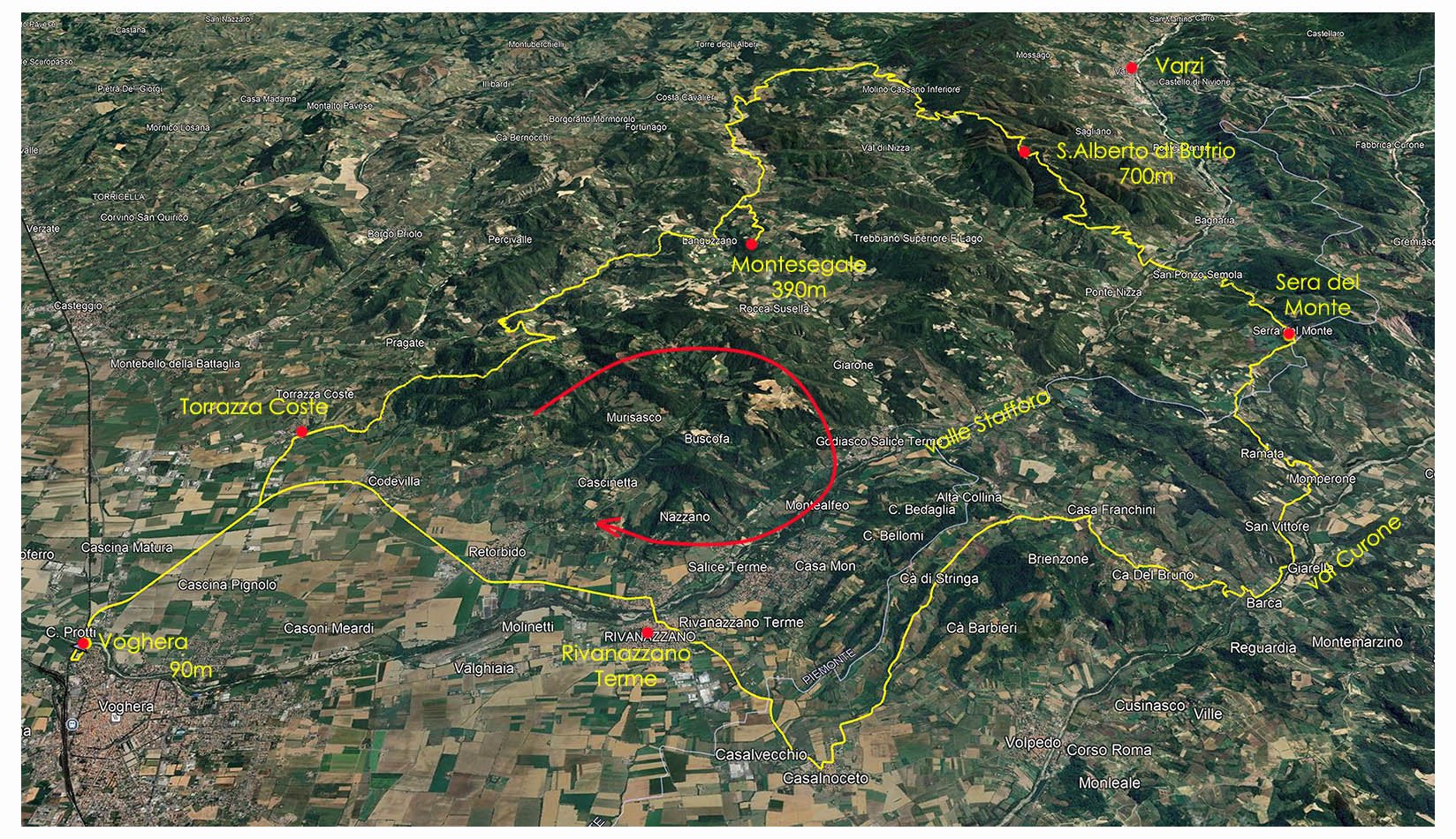 2 Il percorso, 90 chilometro con 2100 metri di dislivello positivo. Come dicevo, partenza da Voghera, in breve salgo sulle prime alture a Torrazza Coste e poi è tutto un su e giù tra valli e vallette secondarie e dorsali tra la valle Staffora, la val Curone, la val Schizzola e la Ardivestra. |